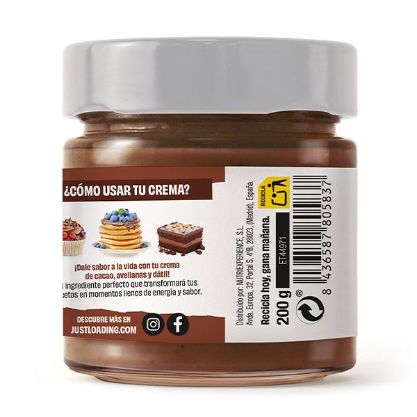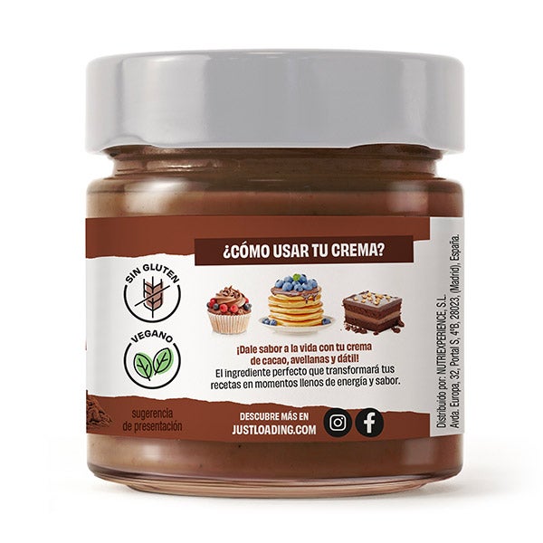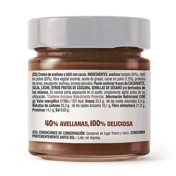 Avellanas tostadas (40%), dátil en polvo (20%), fibra dietética vegetal (inulina), aceite de girasol, cacao en polvo (7,5%), proteína de arroz, emulgente: lecitinas, aromas naturales.