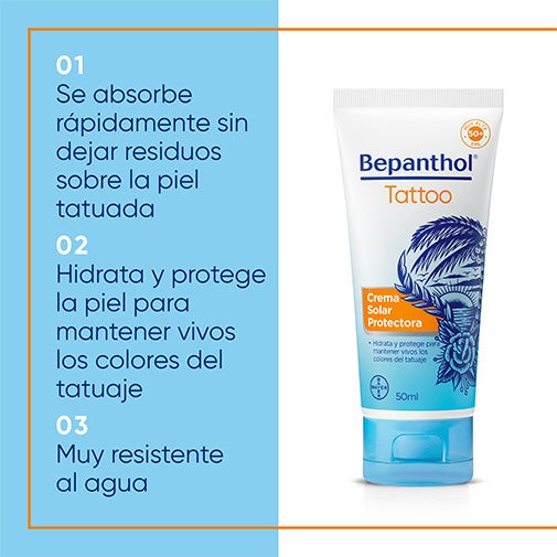 Bepanthol® Tattoo Creme Solar SPF50 50 ml Protetor solar SPF 50 formulado especificamente para proteger as tatuagens.