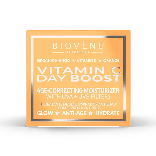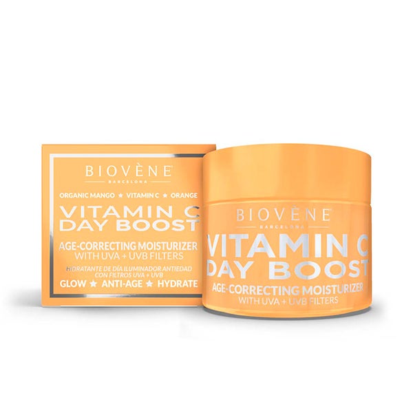 Creme de dia hidratante DAY BOOST corretor de idade feito com vitamina C e manga orgânica que hidrata imediatamente a pele para iluminar a falta de brilho e dar as boas-vindas a um brilho juvenil.