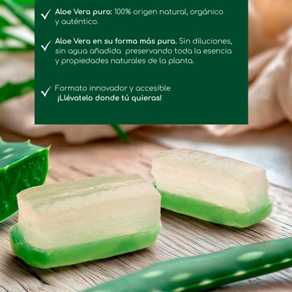 Elaborados com polpa pura de Aloe Vera, em forma de cubo e revestidos com uma cera natural, esses cubos conservam toda a essência e propriedades da planta, sem água adicionada além da própria do Aloe Vera.