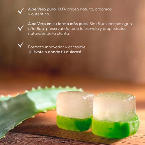 Elaborados com polpa pura de Aloe Vera, em forma de cubo e cobertos com uma cera natural, esses cubos conservam toda a essência e propriedades da planta, sem água adicionada além da própria do Aloe Vera.