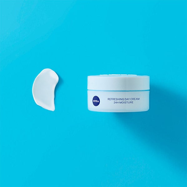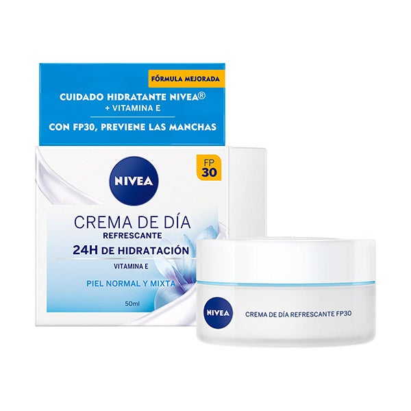 NIVEA Creme de Dia Refrescante com FP30 para peles normais e mistas hidrata intensamente até 24 horas, equilibrando o nível de hidratação da própria pele. A fórmula melhorada de cuidado hidratante NIVEA® com Vitamina E e extrato de Nenúfar refresca e preenche a pele, protegendo-a contra os agentes externos. Com FP30, proporciona extra proteção contra o efeito nocivo dos raios solares e o envelhecimento precoce, enquanto previne o aparecimento de manchas. DERMATOLOGICAMENTE COMPROVADO.