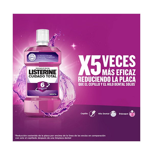 Graças à ação combinada dos óleos essenciais com o flúor e o cloreto de zinco deste enxaguante bucal, Listerine Cuidado Total garante uma limpeza profunda e uma proteção completa que oferece 6 benefícios para uma saúde bucal completa.