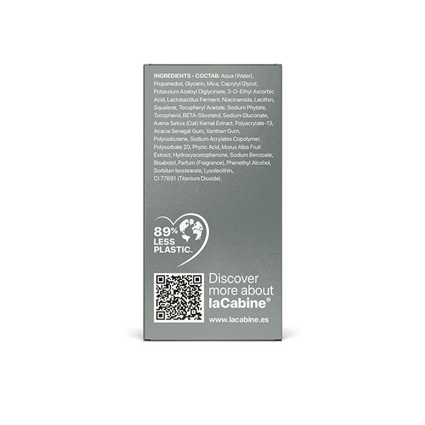 INGREDIENTS: Aqua (Water), Propanediol, Glycerin, Mica, Caprylyl Glycol, Potassium Azeloyl Diglycinate, 3-O-Ethyl Ascorbic Acid, Lactobacillus Ferment, Niacinamide, Lecithin, Squalene, Tocopheryl Acetate, Sodium Phytate, Tocopherol, BETA-Sitosterol, Sodium Gluconate, Avena Sativa (Oat) Kernel Extract, Acacia Senegal Gum, Xanthan Gum, Sodium Acrylates Copolymer, T-Butyl Alcohol, Phytic Acid, Morus Alba Fruit Extract, Polyacrylate Crosspolymer-6, Hydroxyacetophenone, Sodium Benzoate, Bisabolol, Parfum (Fragrance), Phenethyl Alcohol, Lysolecithin, CI 77891 (Titanium Dioxide).