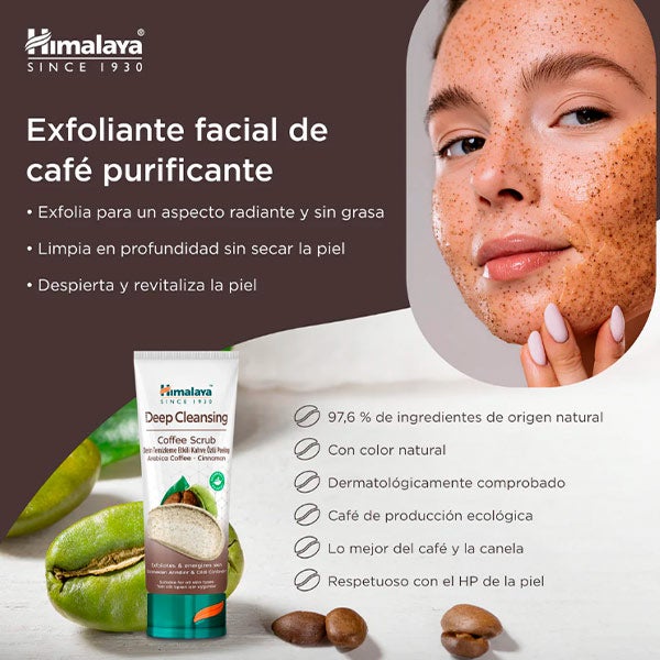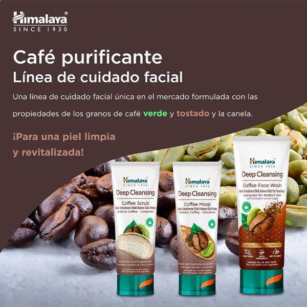 O Esfoliante facial de ação profunda de Café do Himalaia contém uma mistura eficaz de Café Arábica e Canela que esfolia suavemente as células mortas da pele. Os grãos de Café Arábica torrados e verdes, ricos em potentes antioxidantes, contribuem para uma pele mais radiante e fresca e, junto com a canela, ajudam a proporcionar uma sensação de energia.