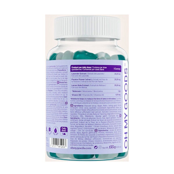 Jarabe de glucosa, Azúcar, Agua, Pectina, Ácido cítrico, Extracto de flores de Lavanda (Lavandula angustifolia), Extracto de partes aéreas de la Flor de Pasión (Passiflora incarnata), Extracto de hoja de Melisa (Melissa officinalis), Concentrado de espirulina, Citrato trisódico, Aromatizante natural, Aceite vegetal (coco), Clorhidrato de piridoxina, Melatonina, Cera de carnauba.