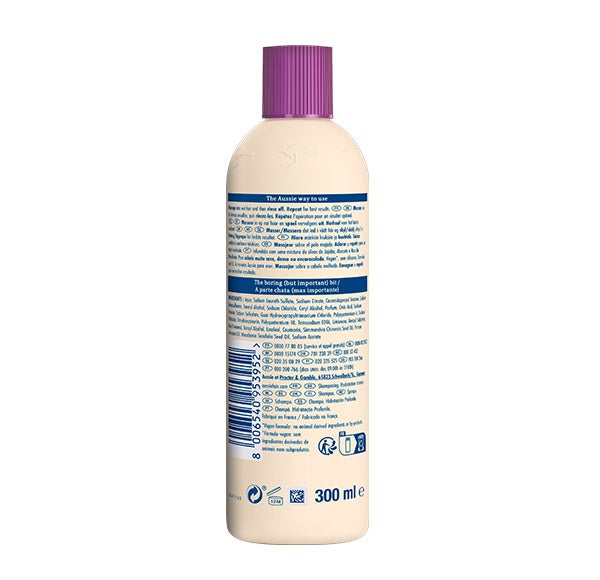Este shampoo Aussie ultra-intenso está enriquecido com uma mistura tripla de óleo de jojoba, de abacate e de noz de macadâmia e oferece uma intensa hidratação ao cabelo encaracolado, grosso e seco, deixando sua cabeleira nutrida. Este shampoo limpa e elimina os resíduos ao mesmo tempo que reidrata o cabelo. Este shampoo vegano conta com uma fórmula sem SLS nem silicone e foi elaborado sem crueldade animal.
