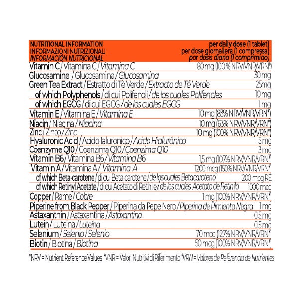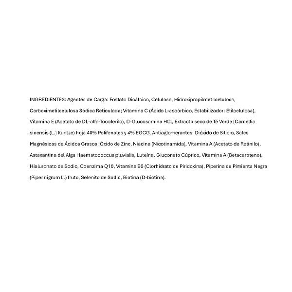 INGREDIENTES: Agentes de Carga: Fosfato Dicálcico, Celulosa, Hidroxipropilmetilcelulosa, Carboximetilcelulosa Sódica Reticulada; Vitamina C (Ácido L-ascórbico, Estabilizador: Etilcelulosa), Vitamina E (Acetato de DL-alfa-Tocoferilo), D-Glucosamina HCl, Extracto seco de Té Verde (Camellia sinensis (L.) Kuntze) hoja 40% Polifenoles y 4% EGCG, Antiaglomerantes: Dióxido de Silicio, Sales Magnésicas de Ácidos Grasos; Óxido de Zinc, Niacina (Nicotinamida), Vitamina A (Acetato de Retinilo), Astaxantina del Alga Haematococcus pluvialis, Luteína, Gluconato Cúprico, Vitamina A (Betacaroteno), Hialuronato de Sodio, Coenzima Q10, Vitamina B6 (Clorhidrato de Piridoxina), Piperina de Pimienta Negra (Piper nigrum L.) fruto, Selenito de Sodio, Biotina (D-biotina).