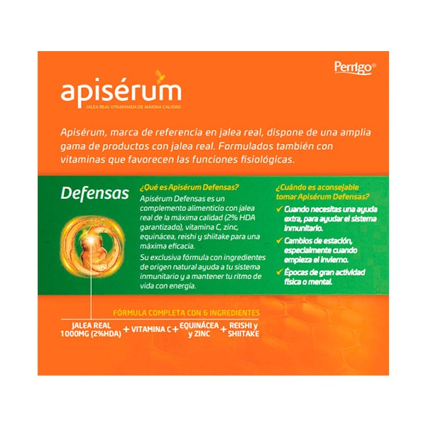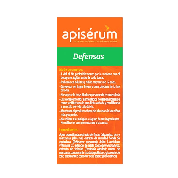 Apiserum Defesas é um suplemento alimentar à base de geleia real de máxima qualidade (2% HDA garantido), vitamina C, zinco, equinácea, reishi e shitake para máxima eficácia.