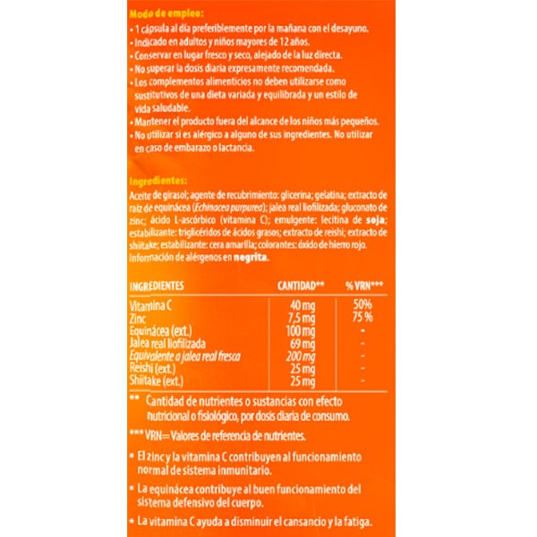 Aceite de girasol;agente de recubrimiento:glicerina;gelatina;extracto de raiz de equinacea (echinacea purpurea);jalea real liofilizada;gluconato de zinc;acido L-ascorbico(vitamina C);emulgente:lecitina de soja;establizante:triglicéridos de ácidos grasos;extracto de reishi;extracto de shiitake;estabilizante:cera amarilla;colorantes:oxido de hierro rojo.