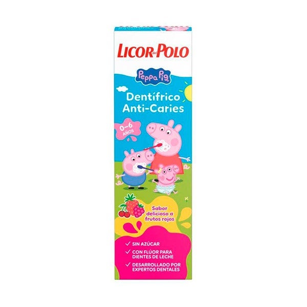 Descubra a escovação com Peppa e seus irmãos! A pasta de dentes Licor del Polo x Peppa foi especialmente desenvolvida para proteger contra as cáries desde o aparecimento do primeiro dente de leite. Sua fórmula com cálcio fortalece os dentes de leite e ajuda a formar uma base sólida para dentes permanentemente saudáveis. Contém 1000 ppm de flúor e seu delicioso sabor a frutos vermelhos torna a escovação um momento divertido todos os dias.