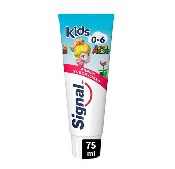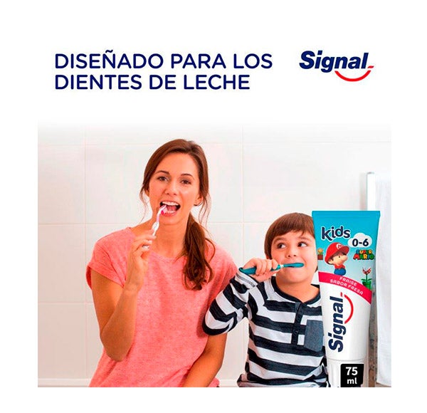 Nuevo dentífrico Signal infantil 0-6 años con sabor a fresa, para una protección a largo plazo contra las caries. Diseñado específicamente para las necesidades de los niños de hasta 6 años. Signal Kids 0-6 Fresa tiene una fórmula extra suave, diseñada para niños. Con nuestra nueva tecnología de remineralización de fluoruro, fortalece los dientes y protege contra los ácidos que causan las caries. Protección anticaries a largo plazo, cepillando dos veces al día. Fórmula de baja espuma SIN SLS y SIN colorantes. Sabor de alta calidad, adecuado para niños.