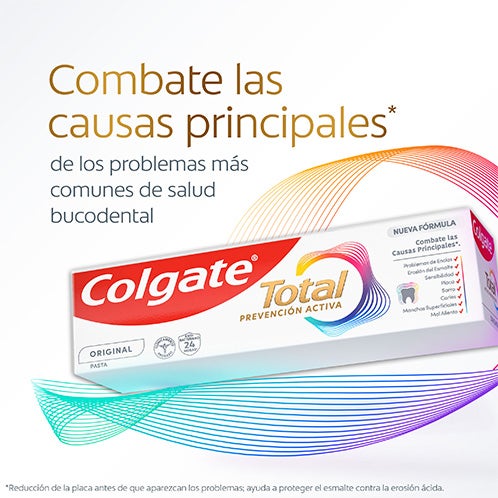 Cuidar da saúde do seu sorriso e mantê-lo protegido começa antes que apareçam os problemas de saúde bucal. A nova fórmula de Colgate Total Prevenção Ativa Original foi cientificamente projetada para a prevenção ativa e para combater as causas principais* dos problemas mais comuns de saúde bucal³. Com 24 horas de proteção antibacteriana¹ comprovada clinicamente e um sistema² único que estabiliza o ingrediente de prevenção ativa, foi projetada para um desempenho superior⁴. Exatamente o que você precisa para proteger seu sorriso de futuros problemas de saúde bucal.