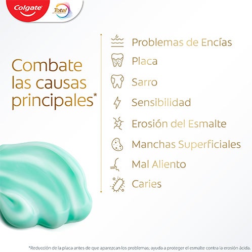 15 vezes mais eficaz combatendo a causa principal⁶ de futuros problemas de saúde bucal quando usado em conjunto com a escova Colgate Total Active Foam e o enxaguante bucal Colgate Total, para sorrisos protegidos e cuidados.