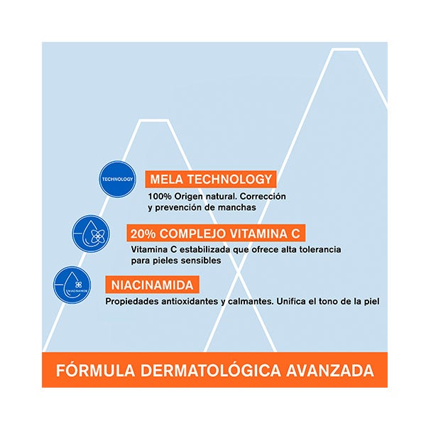 Ingredientes ativos dermatológicos: [ Mela Technology + 20% Complexo Vitamina C* + Niacinamida]