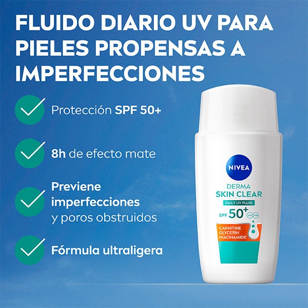 O Fluido Facial Derma Skin Clear FP50+ é um fluido ultraleve especialmente desenvolvido para pele normal, oleosa & com tendência a imperfeições.