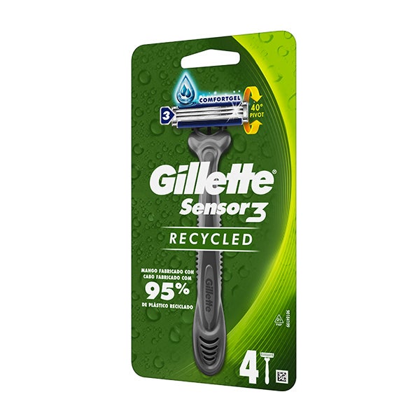 A lâmina de barbear descartável reciclada Gillette Sensor3 oferece o desempenho de barbear de confiança da lâmina de barbear descartável Sensor3.