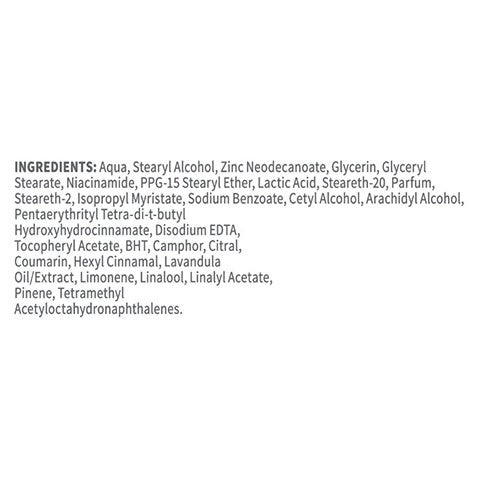 Aqua, Stearyl Alcohol, Zinc Neodecanoate, Glycerin, Glyceryl Stearate, Niacinamide, PPG-15 Stearyl Ether, Lactic Acid, Steareth-20, Parfum, Steareth-2, Isopropyl Myristate, Sodium Benzoate, Cetyl Alcohol, Arachidyl Alcohol, Pentaerythrityl Tetra-di-t-butyl