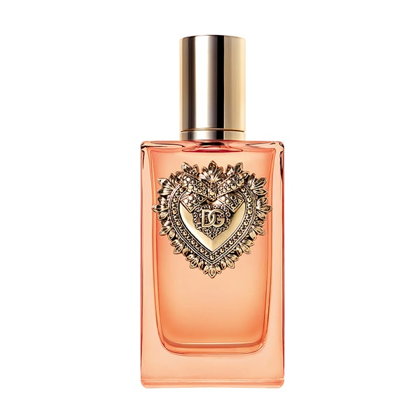Dolce&Gabbana Devotion Eau de Parfum Intense está dentro de um vibrante frasco de vidro tingido em âmbar, adornado com o inconfundível e simbólico Sagrado Coração."