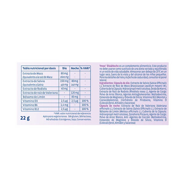 Cápsula de noche: Extracto de Raíz de Valeriana (Valeriana officinalis L.), Extracto de Salvia (Salvia Officinalis L.), Extracto de Bálsamo de Limón (Melissa officinalis L.), Cubierta de la Cápsula: Hidroxipropil metil celulosa, Zanahoria Púrpura, Agente de Carga: Polvo de Arroz Blanco, Anti-Agentes de Cocción: Maltodextrina, Estearato de Magnesio y Dióxido de Silicio, Vitamina D (Colecalciferol, Almidón y Sacarosa).