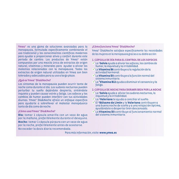 Ymea Dia & Noite é um produto com ingredientes naturais formulados com uma mistura exclusiva de plantas complementadas com vitaminas do grupo B.