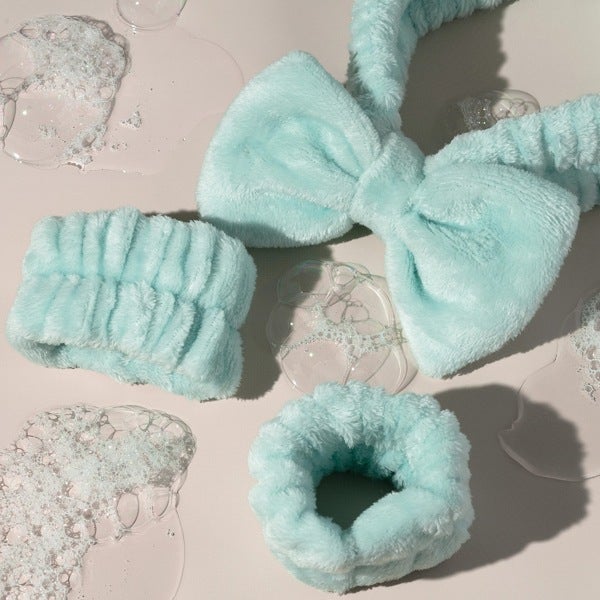 Conjunto de tiara e pulseiras, perfeito para a sua rotina de maquiagem. A tiara mantém o seu cabelo no lugar enquanto você aplica produtos, e as pulseiras ajudam a manter seus pulsos secos, tudo com estilo e conforto!