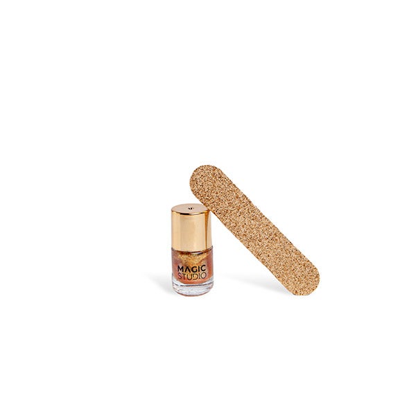 Este presente perfeito contém um esmalte de unhas dourado com brilho e uma lixa para oferecer uma manicure cuidada, brilhante e na moda.