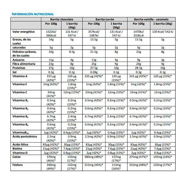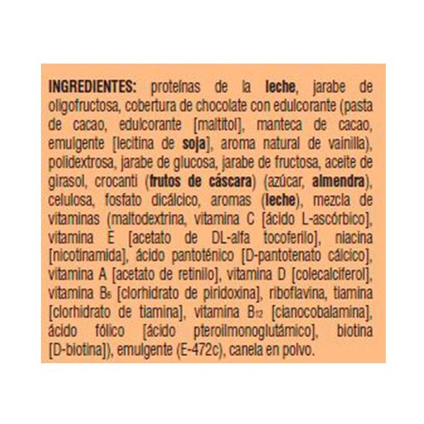 Proteínas de leche, jarabe de oligofructosa, cobertura de chocolate con edulcorante (pasta de cacao, edulcorante (maltitol), manteca de cacao, emulgente (lecitina de soja), aroma natural de vainilla), polidextrosa, jarabe de glucosa, jarabe de fructosa, aceite de girasol, crocanti (frutos de cáscara) (azúcar, almendra), celulosa, fosfato dicálcico, aromas (leche), mezcla de vitaminas (maltodextrina, vitamina C (ácido L-ascórbico), vitamina E (acetato de DL-alfa tocoferilo), niacina (nicotinamida), ácido pantoténico (D-pantotenato cálcico), vitamina A (acetato de retinilo), vitamina D (colecalciferol), vitamina B6 (clorhidrato de piridoxina), riboflavina, tiamina (clorhidrato de tiamina), vitamina B12 (cianocobalamina), ácido fólico (ácido pteroilmonoglutámico), biotina (D-biotina), emulgente (E-472c), canela en polvo.