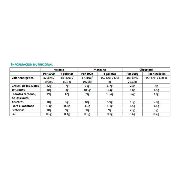 Proteínas de leche, grasa de palma, harina de trigo (gluten), azúcar, gluten de trigo (gluten), almidón de trigo (gluten), cortezas de naranja confitadas (3,8%) (jarabe de glucosa), clara de huevo en polvo, cebada(gluten), aroma, gasificantes (difosfato disódico, carbonato ácido de sodio, carbonato amónico), germen de trigo (gluten), vitaminas (nicotinamida, DL-alfa tocoferol, clorhidrato de piridoxina, riboflavina, clorhidrato de tiamina, ácido pteroilmonoglutámico). Puede contener frutos de cáscara, sésamo, cacahuetes y soja.