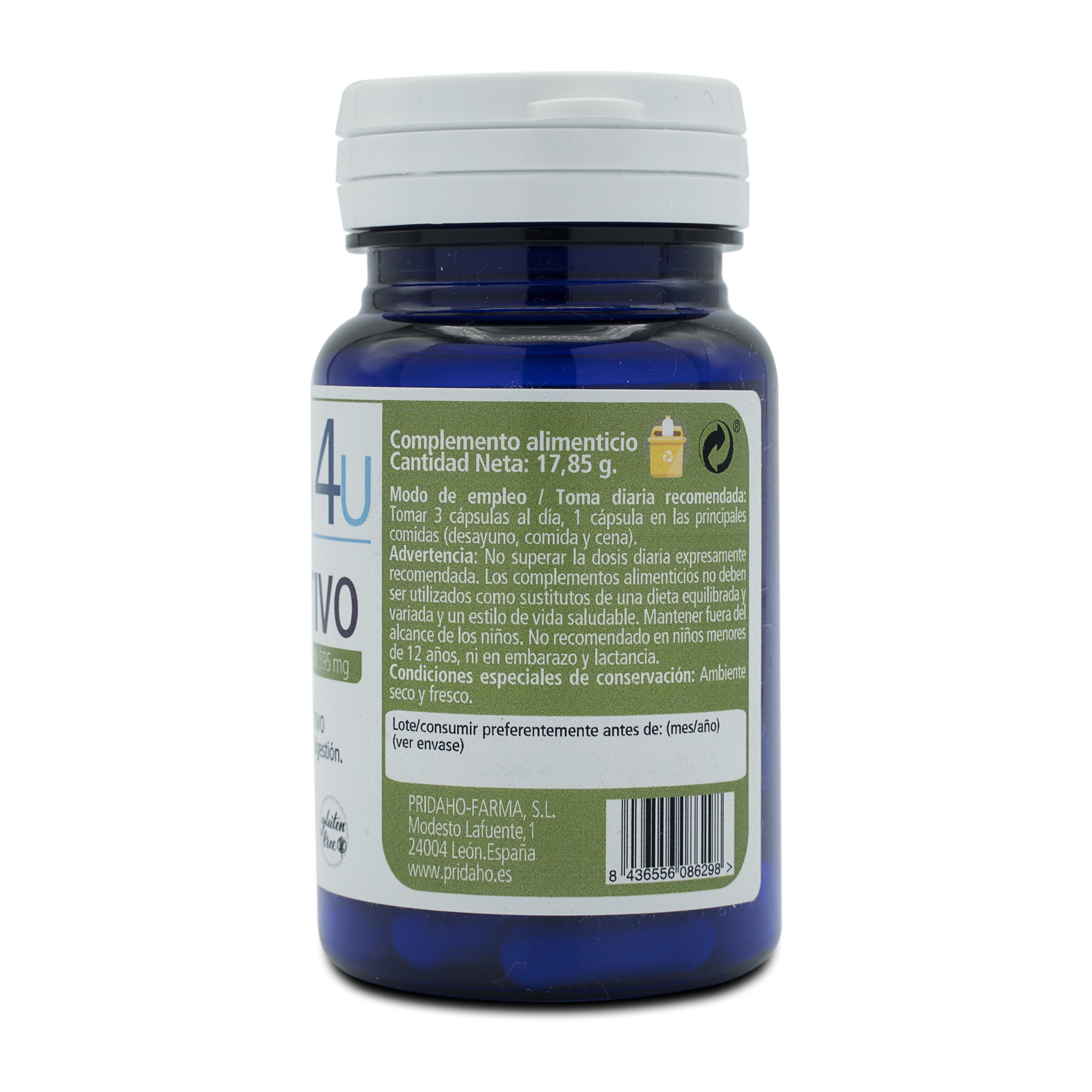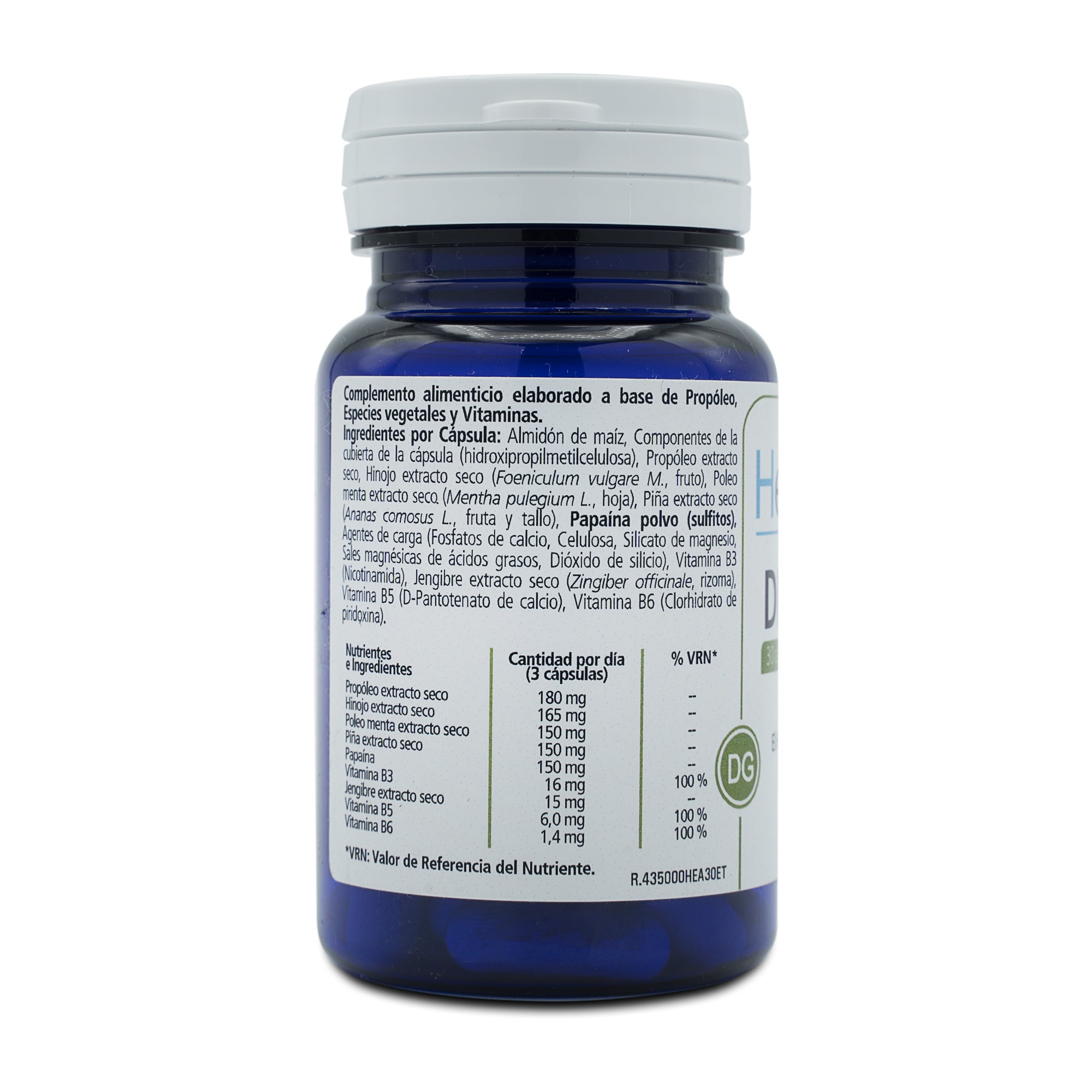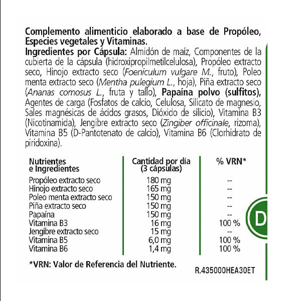 Almidón de maíz, Componentes de la cubierta de la cápsula (hidroxipropilmetilcelulosa), Propóleo extracto seco, Hinojo extracto seco (Foeniculum vulgare M. Fruto), Poleo menta extracto seco (Mentha pulegium L. hoja), Piña extracto seco (Ananaas comosus L. fruta y tallo), Papaína polvo (sulfitos), Agentes de carga (Fosfatos de calcio, celulosa, Silcato de magnesio, Sales magnésicas de ácidos grasos, Dióxido de silicio), Vitamina B3 (Nicotinamida), Jengibre extracto seco (Zingiber officinale, rizoma), Vitamina B5 (D-Pantotenato de calcio), Vitamina B6 (Clorhidrato de piridoxina).