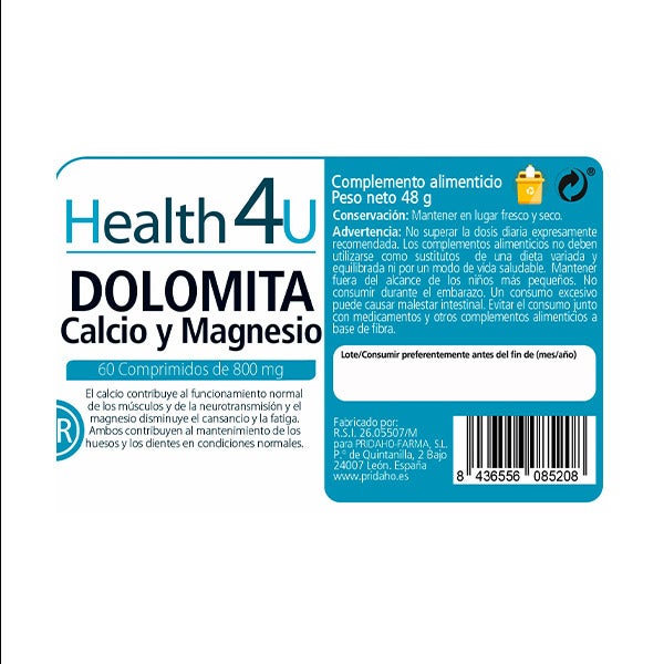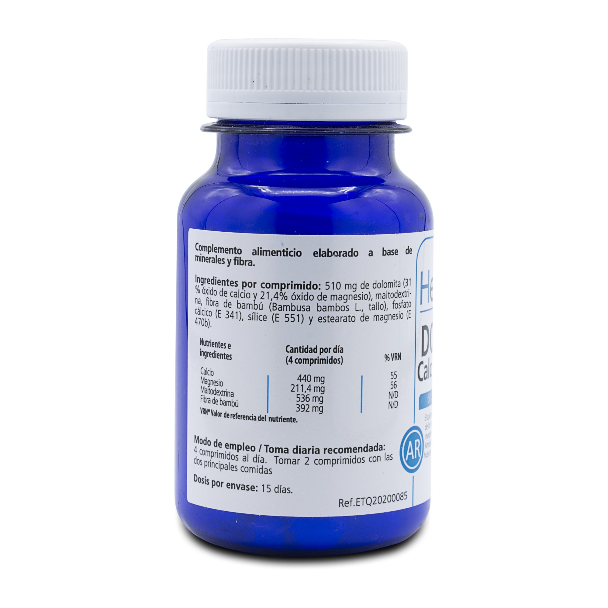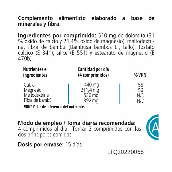 Ingredientes por comprimido: 510 mg de dolomita (31% óxido de calcio y 21,4% óxido de magnesio), maltodextrina, fibra de bambú (Bambusa bambos L., tallo), fosfato cálcico(E341), sílice (E551) y estearato de magnesio (E470b).