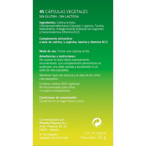 Cafeína anhidra, Hidroxipropilmetilcelulosa (Cápsula), L-arginina, Taurina, Maltodextrina, Antiaglomerante (Estearato de magnesio) y Cianocobalamina (Vitamina B12).