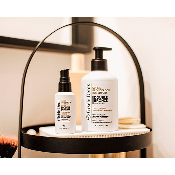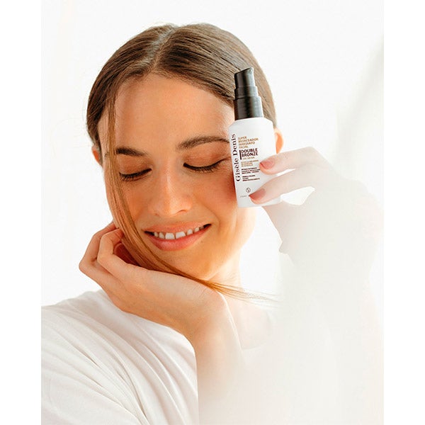 O Super Bronzeador Imediato Facial Double Bronze de Gisèle Denis gera e potencializa o bronzeado de forma natural proporcionando um tom dourado e uniforme no seu rosto. Sua inovadora fórmula exerce uma dupla ação sobre os melanócitos e incorpora ativos que estimulam a síntese de melanina para obter um bronzeado natural a partir dos cinco dias de uso.