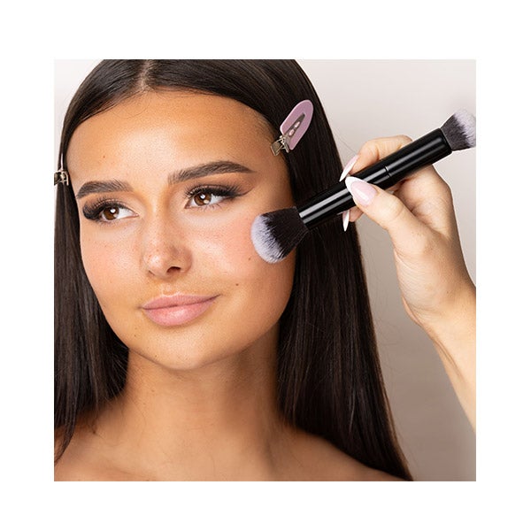 - Misture e fixe o rosto com o pincel para pós, realizando leves movimentos de varredura para controlar o brilho e conseguir um acabamento suave.