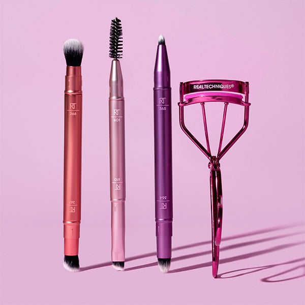 Curvador de Cílios Milagroso: Coloque a almofada de borracha do curvador na base dos cílios. Pressione as alças juntas e mantenha pressionado, depois solte suavemente. Dica do artista: para um ênfase adicional, cubra com uma camada de rímel. Limpe os pincéis semanalmente com o gel de limpeza Brush + Sponge da Real Techniques para um melhor desempenho do pincel.
