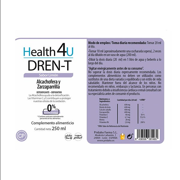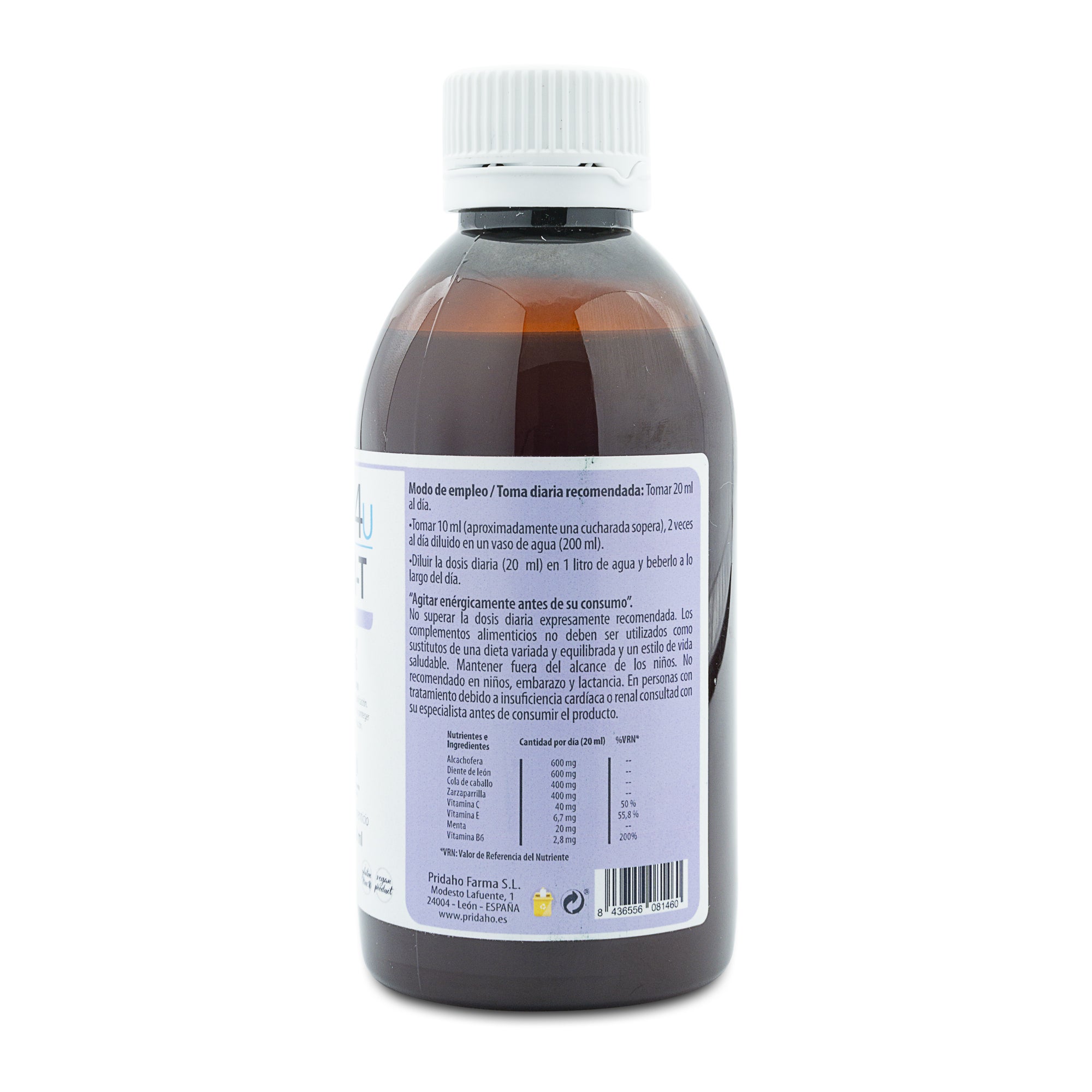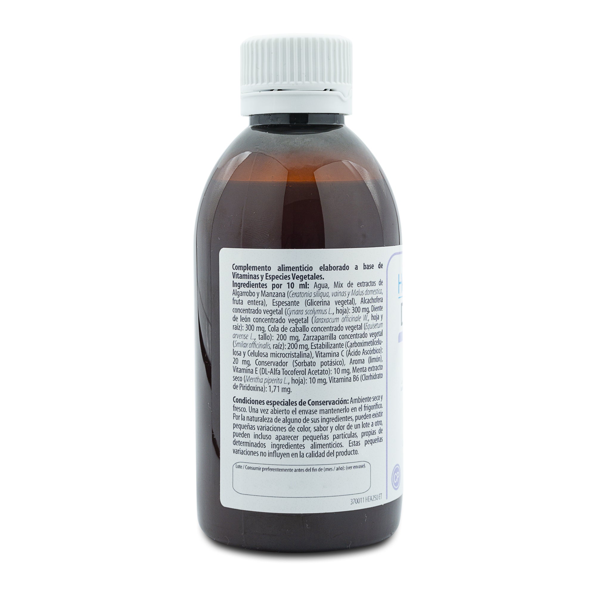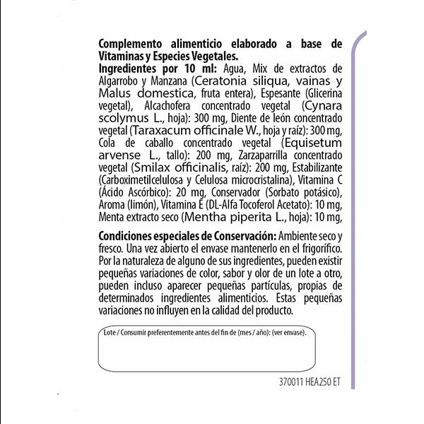 Ingredientes por 10 ml: Agua, Mix de extractos de Algarrobo y Manzana (Ceratonia siliqua, vainas y Malus domestica, fruta entera), Espesante (Glicerina vegetal), Alcachofera concentrado vegetal (Cynara scolymus L., hoja): 300 mg, Diente de león concentrado vegetal (Taraxacum officinale W.,hoja y raÍz): 300 mg, Cola de caballo concentrado vegetal (Equisetum arvense L., tallo): 200 mg, Zarzaparrilla concentrado vegetal (Smilax officinalis, raiz): 200 mg, Estabilizante (Carboximetilcelulosa y Celulosa microcristalina),Vitamina C (Ácido Ascórbico): 20 mg, Conservador (Sorbato potásico), Aroma (limón), Vitamina E (DL-Alfa Tocoferol Acetato): 10 mg, Menta extracto seco (Mentha piperita L., hoja): 10 mg.