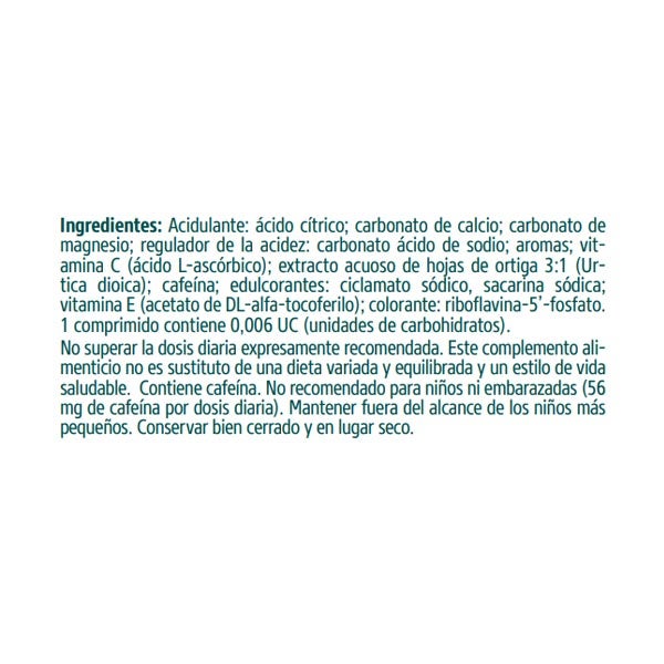 Ingredientes: Acidulante: ácido cítrico; carbonato de calcio; carbonato de magnesio; regulador de la acidez: carbonato ácido de sodio; aromas; vitamina C (ácido L-ascórbico); extracto acuoso de hojas de ortiga 3:1 (Urtica dioica); cafeína; edulcorantes: ciclamato sódico, sacarina sódica; vitamina E (acetato de DL-alfa-tocoferilo); colorante: riboflavina-5'-fosfato.