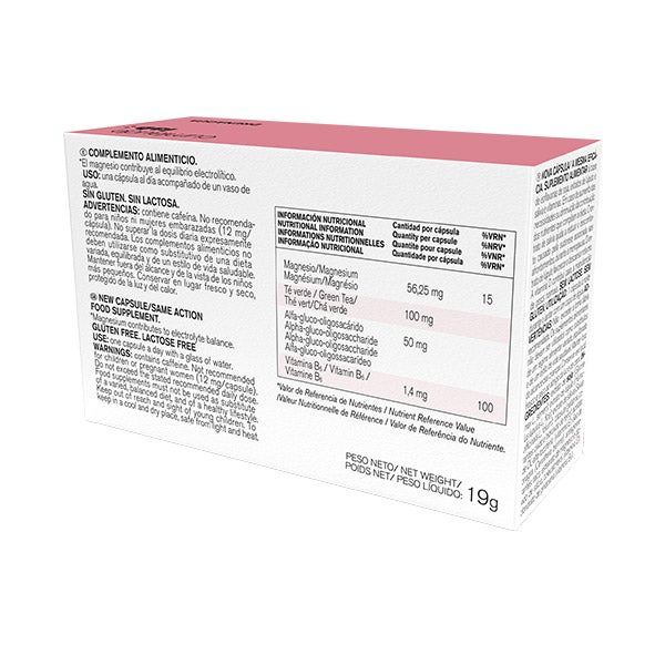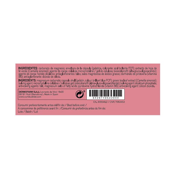 Carbonato de magnesio; envoltura de la cápsula (gelatina, colorante: azul brillante FCF); extracto de hoja de té verde (Camellia sinensis); agente de carga; celulosa microcristalina/gel de celulosa, bioecolians® (alfa-gluco-oligosacárido); agente de carga: fosfato dicálcico, antiaglomerantes: talco, sales magnésicas de ácidos grasos, clorhidrato de piridoxina (vitamina B6); antiaglomerante: dióxido de silicio.