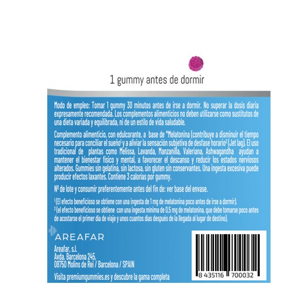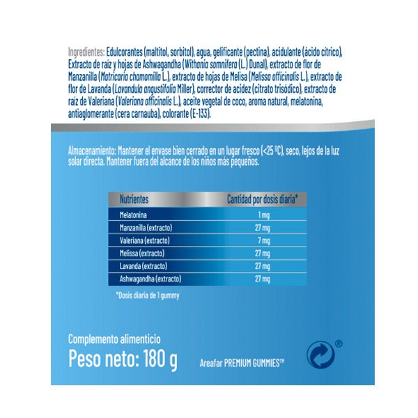 Edulcorantes (maltitol, sorbitol), agua, gelificante (pectina), acidulant (ácido cítrico), extracto de raíz y hojas de Ashwagandha (Withania somnífera L), extracto de flor de manzanilla (Matricaria chamomilla L), extracto de hojas de Melisa (Melissa officinalis L), extracto de flor de lavanda (Lavandula angustifolia Miller), corrector de acidez (citrato trisódico), extracto de raíz de Valeriana (Valerina officinalis L), aceite vegetal de coco, aroma natural, melatonina, anti-aglomerante (cera carnauba), colorante (E-133).