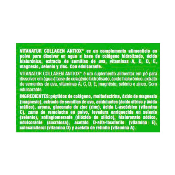 Péptidos de colágeno, maltodextrina, óxido de magnesio (magnesio), extracto de semillas de uva, acidulantes (ácido cítrico y ácido málico), aroma, gluconato de zinc (zinc), ácido L-ascórbico (vitamina C), zumo de remolacha en polvo, levadura enriquecida en selenio (selenio), antiaglomerante (dióxido de silicio), hialuronato sódico, edulcorante (sucralosa), acetato D-alfa-tocoferilo (vitamina E), colecalciferol (vitamina D) y acetato de retinilo (vitamina A).