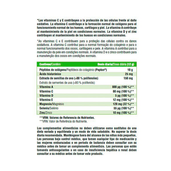 Suplemento alimentar, à base de colágeno hidrolisado (Peptan®), ácido hialurônico, extrato de sementes de uva, vitaminas A, C, D, E, magnésio, selênio e zinco, que graças aos seus ingredientes ajuda a manter o bom estado da pele, ossos e articulações e a proteger as células contra o dano oxidativo.