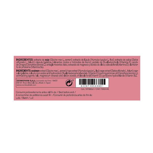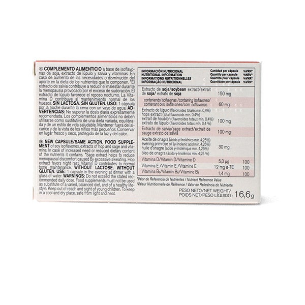 Extracto de soja (Glycine max L. semen); extracto de lúpulo (Humulus lupulus L. flos); extracto de salvia (Salvia officinalis L. folium); cápsula (gelatina, colorantes: óxidos e hidróxidos de hierro); acetato de DL-alfa-tocoferilo (Vitamina E); aceite de Onagra (Oenothera biennis L.); antiaglomerantes: talco, estearato de magnesio y dióxido de silicio; colecalciferol (vitamina D); clorhidrato de piridoxina (Vitamina B).
