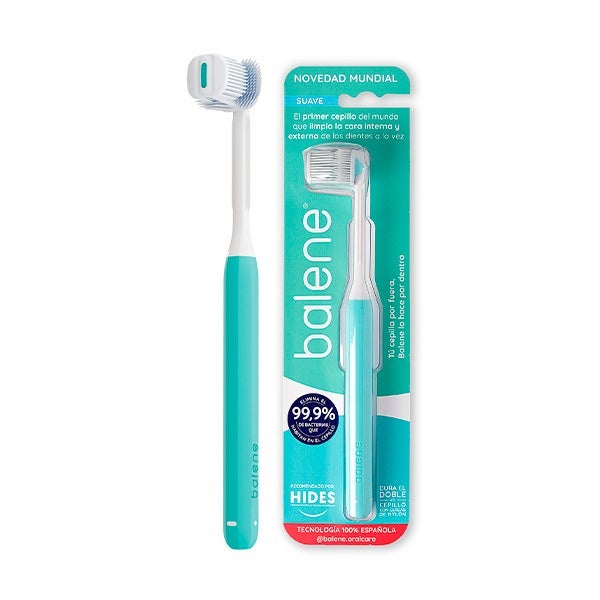 Balene é o primeiro escova do mundo que limpa a face interna, externa e superfície de mastigação dos dentes ao mesmo tempo. Suas cerdas tyflex de nova geração eliminam 99,9% das bactérias que habitam na escova e duram o dobro vs as cerdas de nylon.
