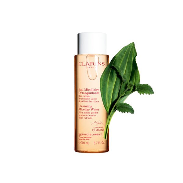 Água micelar desmaquilante enriquecida com o novo duo Gentle Complex (extratos de genciana amarela orgânica e melissa orgânica), proveniente da Fazenda Clarins, que remove a maquiagem de forma suave e rápida, preservando a microbiota cutânea.
