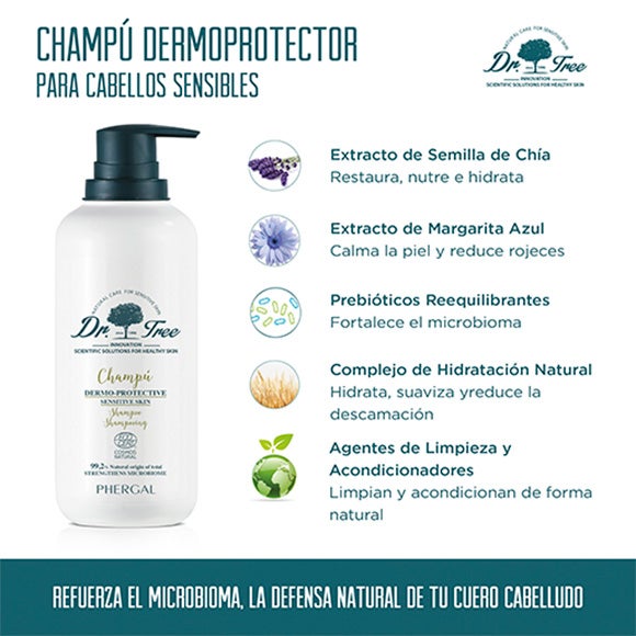 SHAMPOO DERMOPROTETOR PARA COUROS CABELUDOS SENSÍVEIS limpa delicadamente ao mesmo tempo que proporciona força e brilho de forma natural;