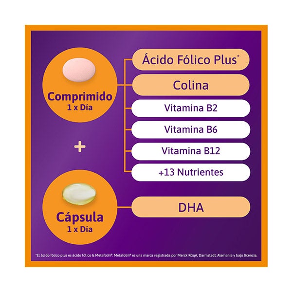 Comprimido: Bitartrato De Colina; Óxido De Magnesio; Agente De Carga: Celulosa Microcristalina; Vitamina C (L-Ascorbato Cálcico); Bisglicinato Ferroso; Agente De Recubrimiento: Hidroxipropilmetilcelulosa; Agente De Carga: Carboximetilcelulosa Sódica Reticulada; Antiaglomerante: Fosfato De Calcio; Almidón; Agentes De Recubrimiento: Hidroxipropilcelulosa, Alcohol Polivinílico, Polietilenglicol, Talco; Niacina (Nicotinamida); Maltodextrina; Óxido De Zinc; Colorante: Carbonato Cálcico, Óxido De Hierro (Rojo); Antiaglomerantes: Sales De Magnesio De Ácidos Grasos; Vitamina E (Acetato De DL-α-Tocoferilo); Ácido Pantoténico (D-Pantotenato Cálcico); Emulgente: Goma De Acacia; Sacarosa; Jarabe De Glucosa; Almidón Modificado; Vitamina B6 (Clorhidrato De Piridoxina); Sulfato De Cobre; Tiamina (Mononitrato De Tiamina); Riboflavina; Ácido Fólico (L-Metilfolato De Calcio (Metafolin)); Ácido Fólico (Ácido Pteroilmonoglutámico); Yoduro Potásico; Seleniato Sódico; Biotina (D-Biotina); Vitamina D (Colecalciferol); Vitamina B12 (Cianocobalamina). Cápsula: Aceite De Pescado Rico En DHA; Gelatina (Piel Bovina); Aceite De Girasol Refinado; Humectante: Glicerol; Antioxidante: Extracto Rico En Tocoferol
