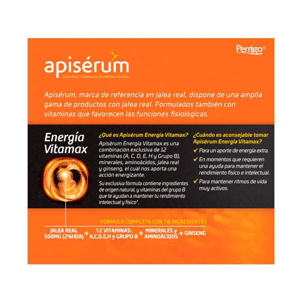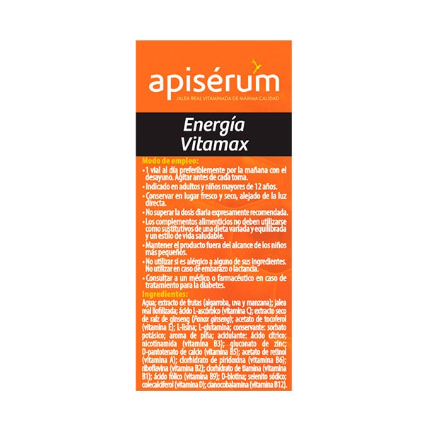 Apiserum Energia Vitamax é uma combinação única de vitaminas, minerais, aminoácidos, geleia real e ginseng, que proporcionam uma ação energizante.