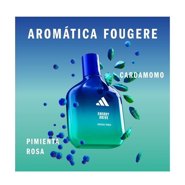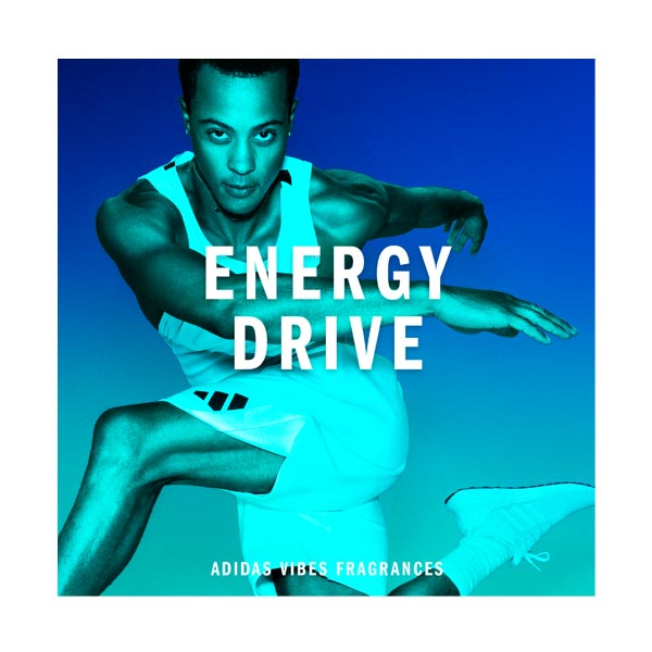 Está comprovado que o perfume Adidas Vibes Energy Drive transmite energia positiva*. Com notas empoderadas e luminosas de cardamomo e pimenta rosa, para oferecer-lhe um imparável surto de energia, como se nada pudesse interpor-se no seu caminho.