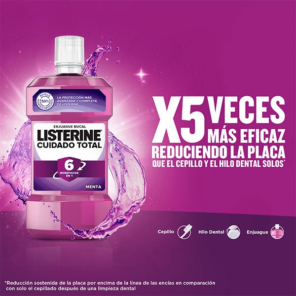 Graças à ação combinada dos óleos essenciais com o flúor e o cloreto de zinco deste enxaguante bucal, Listerine Cuidado Total garante uma limpeza profunda e uma proteção completa que oferece 6 benefícios para uma saúde bucal completa.