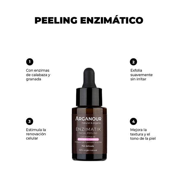 Peeling formulado a partir de uma nova geração de ácidos “AKA”, enzimas de romã e abóbora para conseguir uma esfoliação sem irritação, melhorar a textura e o tom da pele.